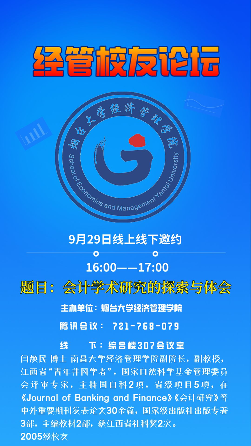 9月29日,经管员工论坛第三讲,本次邀请到的是闫焕民,题目:会计学术研究的探索与体会。论坛由太阳成集团tyc234cc副经理李振杰主持,会计系系主任孙晓妍等师生员工近200人参加论坛。闫焕民,副教授,博士,南昌大学经济管...
