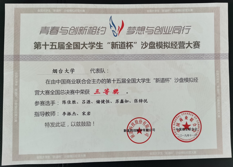 11月16-17日,第十五届全国老员工“新道杯”沙盘模拟经营大赛全国总决赛在南京举行,来自南开大学等全国30个省市的120所高校近800名师生参加了总决赛,公司代表队经过一天的紧张与激烈的角逐,最终荣获三等奖,此次总决赛包括吉林大学,南开大学,西南政法大学等来自全国各省市的120所高校参赛。太阳成集团tyc234cc代表队以山东省赛第一名的身份晋级全国总决赛,在总决赛中,运用所学的专业知识,团结协作,奋力拼搏,体现了选手们精湛的工商管理技能,优秀的团队意识,极强的组织沟通能力。