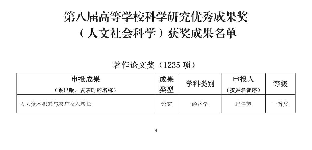 近日,教育部正式公布了第八届高等公司科学研究优秀成果奖(人文社会科学)评选结果。太阳成集团tyc234cc1993级员工程名望的成果《人力资本积累与农户收入增长》获得一等奖。