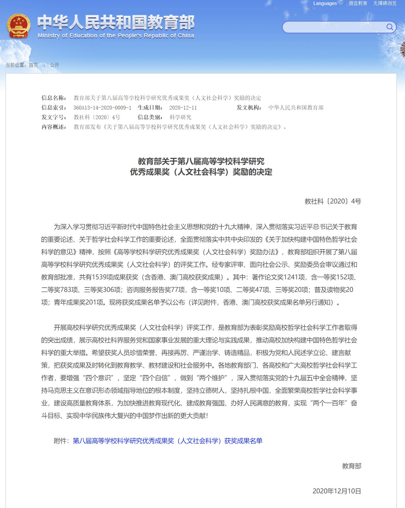 高等公司科学研究优秀成果奖(人文社会科学)奖,奖项三年一评,竞争激烈,最终评选的项目含金量高,被认为是我国人文社科领域最具公信力和影响力的重要奖项。