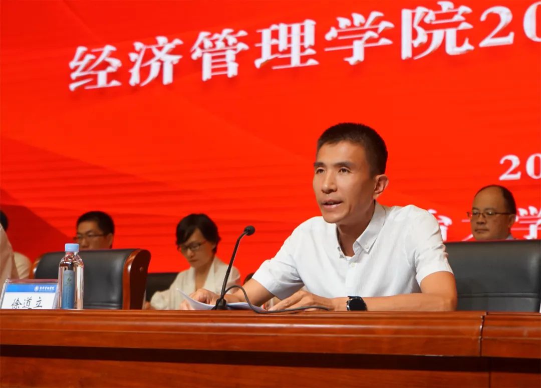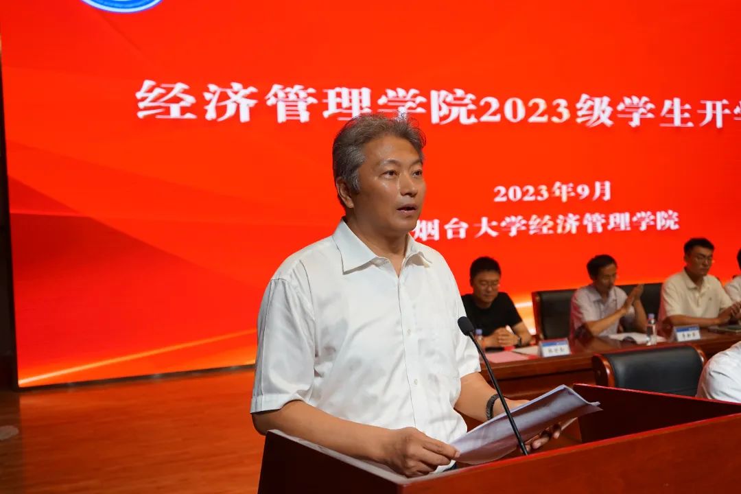 在师生代表发言环节,1999级员工、青岛锦天丽达国际贸易有限公司董事长韩世勤分享了在烟大求学的经历,以此鼓励同学们要以热爱的心态对待学习生活,勇敢成为闪闪发光的自己。教师代表李新军老师勉励同学们要做一个志存高远、脚踏实地,以知促行、以行求知,直面挫折、勇于担当,开放包容、互助互信的经管人。研究生代表孙楠以学姐身份向新入学的学弟学妹们讲述她求学过程中的成长故事,鼓励学弟学妹们树立目标、不忘初心,在一次一次的选择中锚定青春模样。本科生代表孙亦婷向新同学们送上了真诚的祝愿,希望大家都能不负青春、锻炼能力,不忘初心、严于律己。研究生新生代表刘宇洋,讲述自己对于研究生的认识,并表示将会在以后的学习生活中做到刻苦钻研、持之以恒。本科生新生代表王轲抒发自己在军训中的感悟,并表示在接下来的学习生活中不辜负老师的期望,发掘自身潜力,见证自己的成长蜕变。