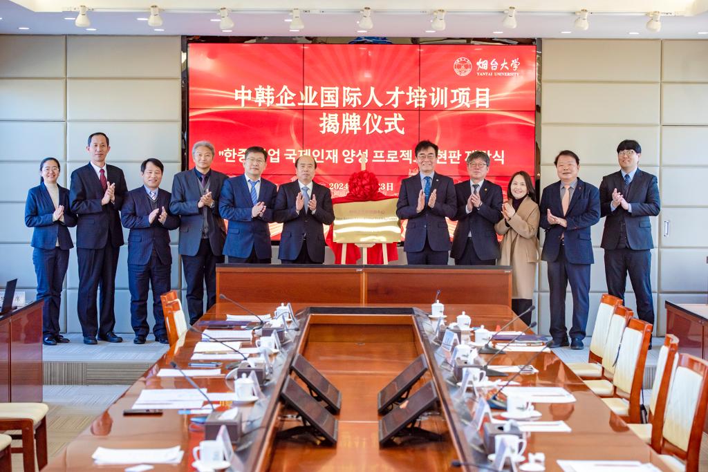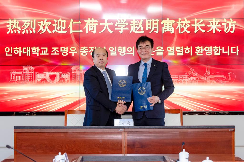 12月23日,韩国仁荷大学董事长赵明寓、副董事长金雄熙一行来校访问。董事长郝曙光、副董事长王洪波会见客人。太阳成集团tyc234cc经理宋岩、书记张广毅参加座谈交流。郝曙光和赵明寓代表两校签署《中韩企业国际人才培养项目》协议并进行揭牌。