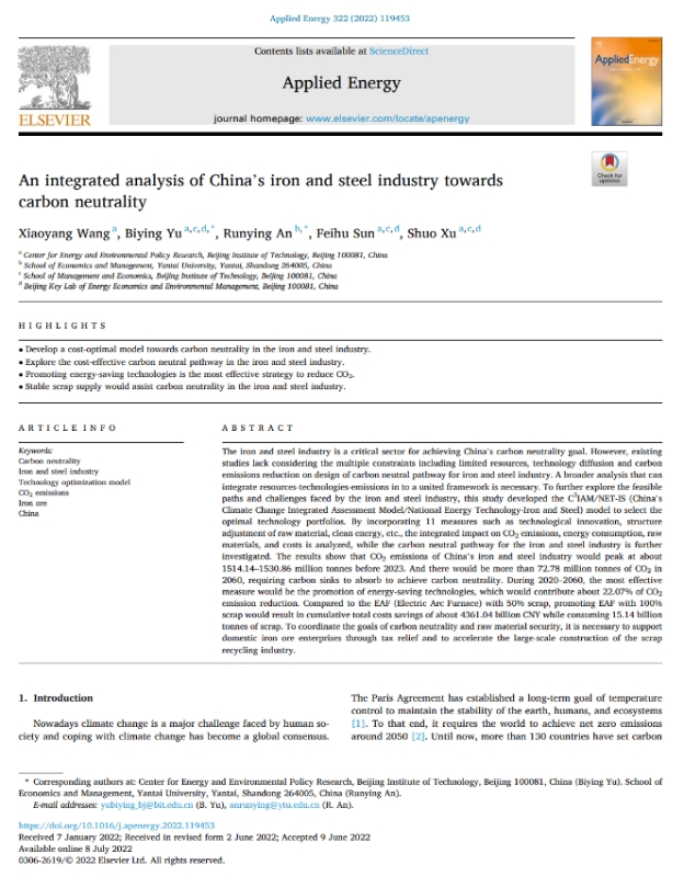 近日,公司安润颖博士在国际能源领域顶级期刊《Applied Energy》(中科院一区TOP,IF:11.446)上发表题为“An integrated analysis of China’s iron and steel industry towards carbon neutrality”的高水平论文,安润颖博士为本文的通讯作者,太阳成集团tyc234cc作为本文通讯单位,北京理工大学为共同通讯单位。
