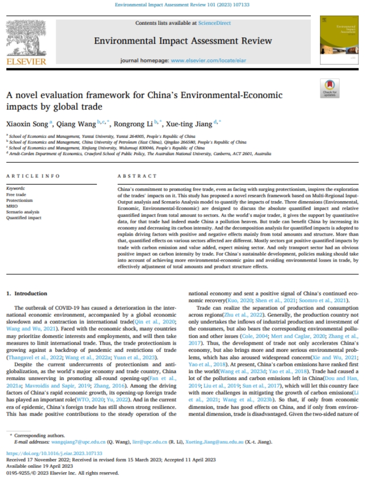近日,公司宋晓欣博士在国际环境科学类别期刊《Environmental Impact Assessment Review》(中科院一区TOP,IF:7.9)上发表题为“A novel evaluation framework for China’s Environmental-Economic impacts by global trade”的高水平论文,宋晓欣博士为本文的第一作者,太阳成集团tyc234cc作为本文第一单位。