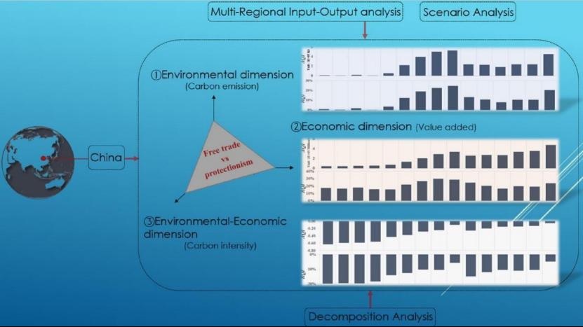 研究团队基于投入产出分析和情景分析模型,提出一种新颖的评价框架量化贸易活动的影响。研究选取了“环境”、“经济”、“环境-经济”三维研究视角,从总量到行业分量层面分别探讨了贸易的绝对影响和相对影响。结果表明,中国作为贸易活动主要参与者,其在“环境”维度的污染天堂假说和“经济”维度的贸易推动经济发展的观点得到数据检验,在“环境-经济”维度的量化影响指出贸易活动降低了碳排放强度。此外,本研究还探讨了量化贸易影响的部门异质性、并分解分析了总量和结构效应的驱动因素。本研究致力于为国家可持续发展政策制定提供数据支撑,通过合理调节贸易的影响、推动实现贸易中获得更多的环境经济收益和避免环境损失。